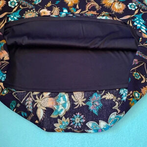 XHILARATION floral paisley tropical gauzy cutout choker halter neckline knee length swing dress fully lined. High neck with 2 buttons on back of collar. The background color is a deep purple in sunlight and more navy blue indoors. I tried to show this with 2 close up photos.