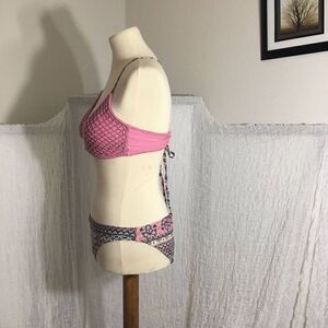 Two piece bikini swimset. Rose dust pink crochet bikini top, and multi print bikini bottom. Pre-owned in good condition. Please refer to pictures for best description and condition verification.