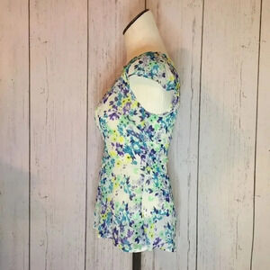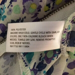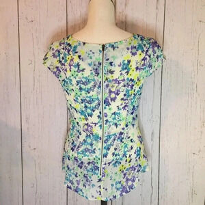 Like new, white with purple & green flowers. Peplum, cap sleeves. Zipper in back. 100% polyester.