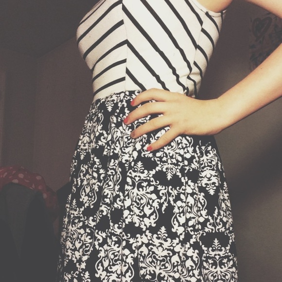 Black and White dress, colorblock "patternblock" black and white stripes on torso, and a dasmac pattern on the bottom. Zipper on the back of the dress, about the length of the torso. Contact me fore more information😊