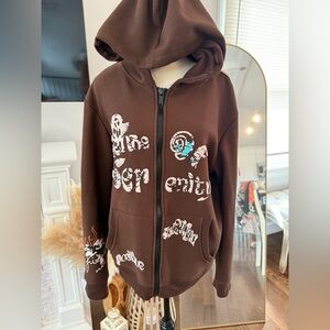 Stylish brown women's sweater with unique graphic designs. Perfect for casual outings. Positivity