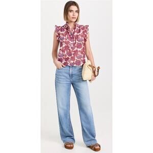 Effortlessly romantic and light as air, the XIRENA Brenna top in Electric Red features a charming hand-sketched floral print on a luxurious cotton-silk voile blend. A relaxed fit silhouette with standout feminine details, this elevated everyday blouse blends bestselling elements from the Caspian and Bex styles. Designed with a band collar, ruffled neckline and front placket, fluttery sleeve accents, and a ruched back yoke for ease and shape. This button-front top is perfect tucked into high-rise jeans, flowy skirts, or tailored trousers for a chic, carefree look.
