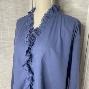 Crown blue Kayde shirt with ruffled front that sways with feminine flair—button up adds classic polish, cotton fabric drapes lightly for all-day ease. Ideal for casual outings or office days; your versatile, lightly faded essential for effortless, blue-toned sophistication and joyful confidence!