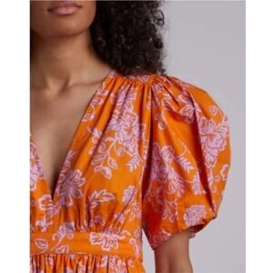XIRENA Larkyn Dress in Tropicana Orange print. Swingy and sweet, this XIRENA dress is crafted in crisp cotton poplin and features charming puff sleeves and an easy fit for an everyday-ready midi dress you'll want to wear all season long.