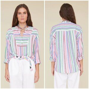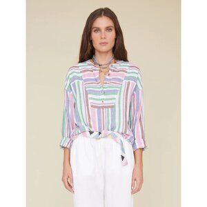 Read between the lines. An everyday blouse from Xi RENA, a contemporary line known for its casual, classic pieces. Made from 100% cotton in a baby pink, periwinkle and mint green stripe pattern, the Macyn top is designed with a buttoned V-neck, floaty short sleeves and a loose, flowy fit.
