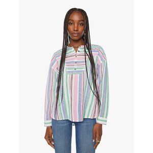 Striped Delight. Updated in the brand's rich, multi-color washed cotton stripe, Macyn is an easy button-front henley with a band collar, front yoke, box pleat back yoke, full length sleeves with a button cuff, and shirttail hem.