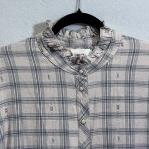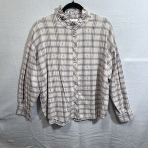 XIRENA Plaid Jensen Flannel Top Size L Oversized Boxy Pearl Snap Ruffle Neck