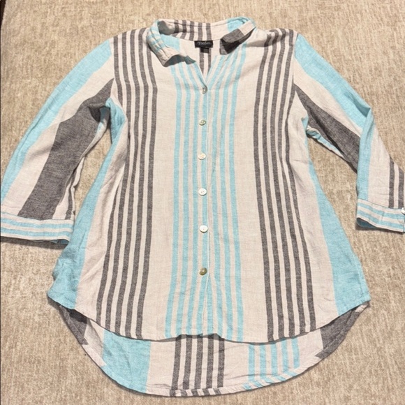 XL 100% Linen Tunic button up striped LONG shell buttons long sleeve Beachy