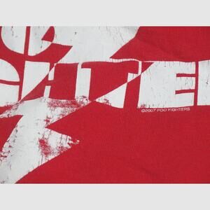 Rock out with this authentic vintage Foo Fighters t-shirt from their 2007 tour! This iconic red tee features the band's signature lightning bolt logo, a must-have for any true fan. While the tag is missing, its vintage appeal is enhanced by a desirable, nicely faded look and wear to the graphics, telling a story of rock 'n' roll history. In good condition, this piece is perfect for concerts, casual wear, or adding a legendary touch to your band tee collection. Based on the measurements I would say this would fit large to XL.