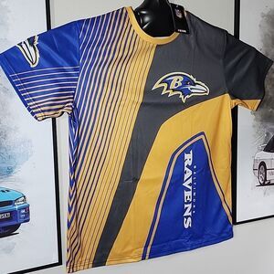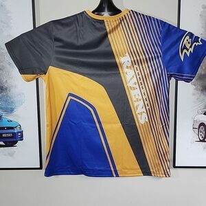 Bold Baltimore Ravens graphic t-shirt in blue, yellow, and black. Perfect for fans.