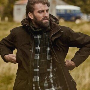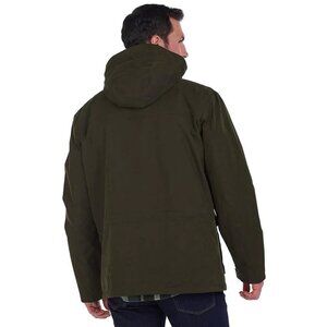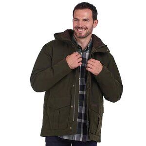 Perfect for the foul weather, this jacket is styled with classic Barbour countrywear in mind and features a waterproof breathable membrane, quilted lining for warmth and a detachable hood. This jacket has a zip front with storm flap, angled hand warmer pockets with moleskin pocket bags, and lower bellows pockets for essential storage.