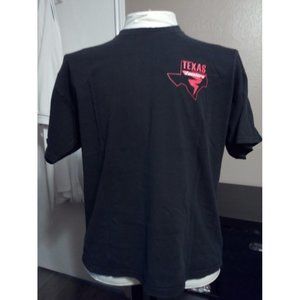 -- Black shirt with two designs, a small one on the front breast, and a large one on the back. Design features an outline of the state of Texas in Red.