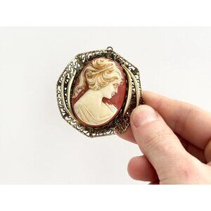 Lovely gold toned oval cameo pendant. This is a faux cameo piece, i believe the carving is made of acrylic. The craftsmanship is really quite the exellent, it looks antique. There is subtle miligrain along the frame. The woman is facing to the right. Would look best with a gold toned chain.