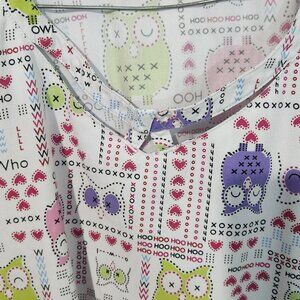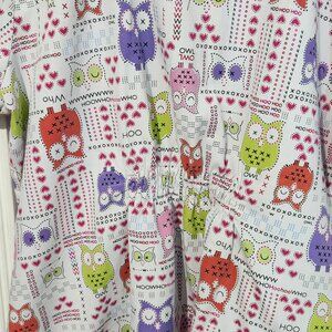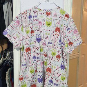 XL Dickies Scrubs White with Red, Purple, and Green Owls with Rouche Back