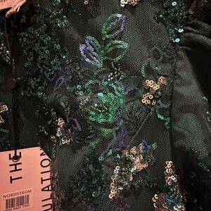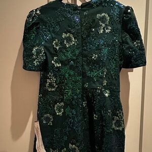 XL. Deep emerald, mini, high neck and short sleeve silhouette with a wrap-style skirt. Ruffles, sparkly floral sequins.