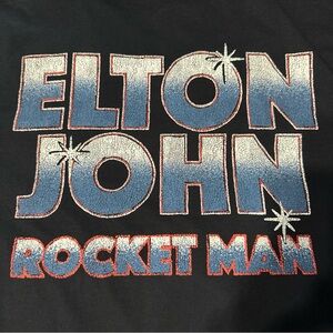 Bold Elton John graphic tee by Lee. Features vibrant red and blue design on black fabric. Perfect for music fans.