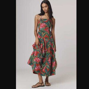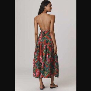 BRAND: Farm Rio x Anthropologie ITEM: Linen blend Dream Garden strappy drop-waist midi dress. The size tag is missing from the Farm Rio tag. Looks like it was ripped off. 55% linen, 45% viscose Drop-waist silhouette Thin tie straps Straight neckline Open back Back zip Hand wash Imported LAST #s of SKU: 704084 SIZE: Women's US XL (see pictures for measurements)