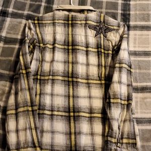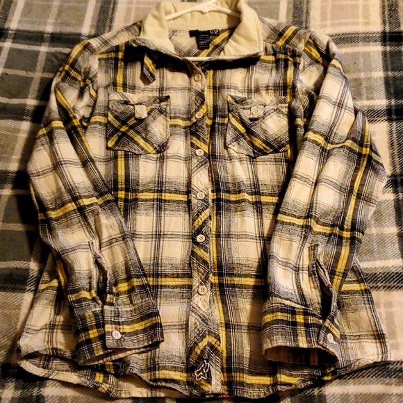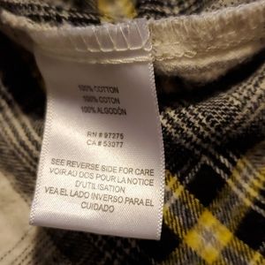 Super cute Fox flannel. Lots of detail. Great colors in the plaid (black, white, yellow, gray). Great condition as far as I can see. Pet friendly/non smoking home.