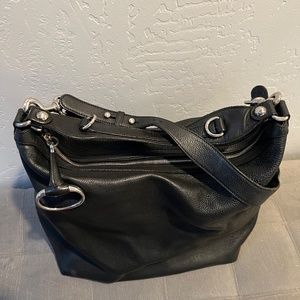 This XL purse is a rare one. It's large enough to carry a gucci pumps shoe box! I included the photo of the box that I put inside the purse to stuff it for the photos. (Box not included) The bag is structure-less and has tremendous volume for many different travel items. The design, although large, fits comfortable next to the body either on the same shoulder or across the body. Ziipper works beautifully and has a large horse-bit hardware pull. You can remove the cross-body shoulder strap and use as a large hobo handbag. I've already sold most of my purses on consignment, but kept this one as a favorite, reconditioned it, and then put it in the dust bag to never used it again. :-( So, she's ready for a new home to love her and use her! This bag has so much usefulness, you will be pleased at how well it can fit into any lifestyle.
