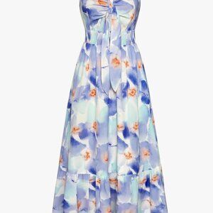 Elegant maxi dress with floral pattern. Features blue and orange hues. Perfect for summer occasions.