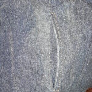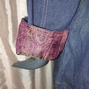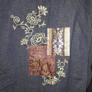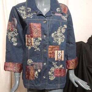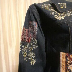 Lovely patchwork designed denim jacket with pockets, paisley cuffs and jewel buttons. Size XL Quality piece