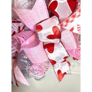About 26 inches, 6 inch-deep door or mantle wreath. Red, White, Pink and silver mesh back. Valentines themed w/ vibrant colored wired ribbons (9 styles). Adorable