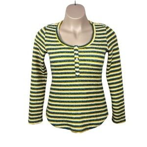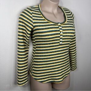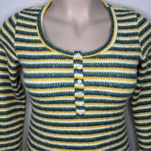 XL Juniors Fuzzy Knit Long Sleeve Top Blue Yellow Green Striped Fitted 7th Ray