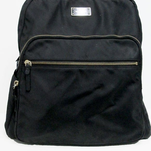 Measurements are approximately 14" x 15" x 6.5". Exterior features: wrap around zipper, two large exterior pockets, 2" locker loop handle, adjustable backpack straps, 2 corner slip pockets, KATE SPADE name plate. Interior features: 10" x 12" x 1" padded electronics pocket, large central compartment, 2 slip pockets