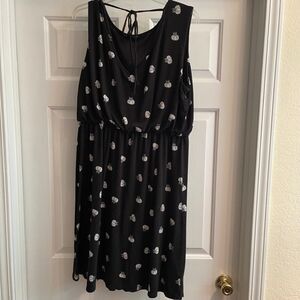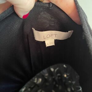 XL LOFT black floral dress. Back has deeper scoop with a tie detailing. Elastic waist. Upper portion is lined, skirt is not. Dress: 95% rayon, 5% spandex. Lining: 100% polyester. In excellent used condition with no stains, rips, tears, pilling, or pulling. Measurements in photos.