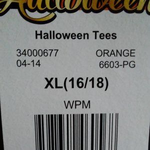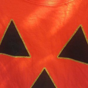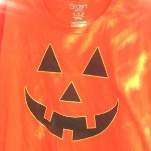 Here we have a bright lady XL t-shirt with a black pumpkin carved face on a orange background. Get this now just in time for Halloween!