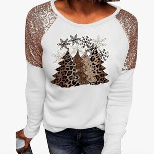 XL Leopard Christmas Tree Snowflake Sequins Splicing Blouse Tee Shirt