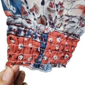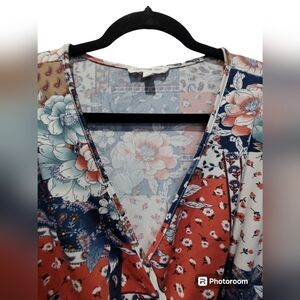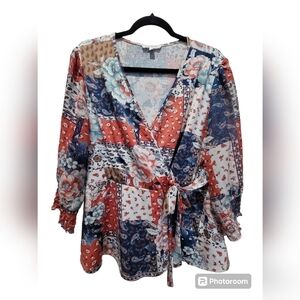 XL Multicolor Floral V Neck Drawstring Waist String Tie Long Sleeve Blouse