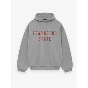 The Essentials Fleece Hoodie has been upgraded in a heavier 480gsm core fleece to provide additional body and structure. A collegiate-inspired "Fear of God State" graphic is screen printed on the front. Details include an overlapped neckline hoodie, rib-knit cuffs, waist-hem, and side pockets. The Essentials Fear of God rubberized label is at the back collar.