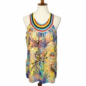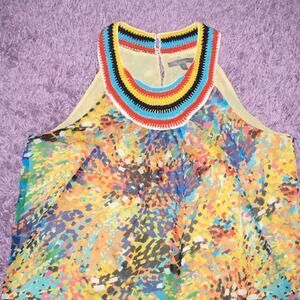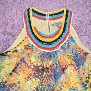 NY Collection Sleeveless Sheer Colorful Confetti Print Flowy Tank Top with Crochet Neckline. Lined.