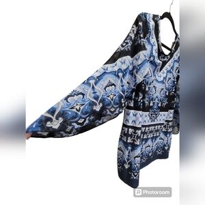 XL Navy Blue Sheer Flowy Sleeve V Neck Tunic Paisley Geometric