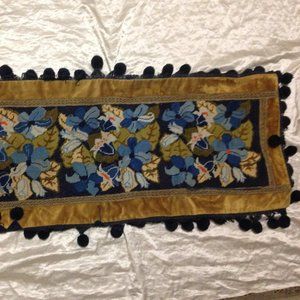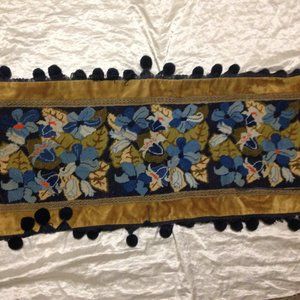 Late 19th/ Early 20th Century Extra Long 45" x18" Tapestry Needlepoint Pillowcase of bundles of Blue Flowers and Leaves, framed within an antique gilt gimping border, and antique gold velvet, with navy blue pom-pom border.
