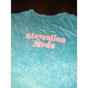 Good Used Condition Women's Size XL Old Navy The Easy Tee Over Sized Tie-Dye Blue with Pink "Staycation Mode" Short Sleeve Crew Neck Tee T-Shirt Top