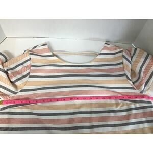 This Anthropologie Jolene top in size XL features a round neckline and short casual sleeves with a button closure. The multicolored striped pattern gives it a bohemian vibe, perfect for any casual occasion. Made of a comfortable cotton blend knit fabric, it can be machine washed for easy care. The relaxed fit and tunic style make it a versatile addition to any wardrobe, suitable for all seasons. Whether you're dressing up or down, this top is a great choice.