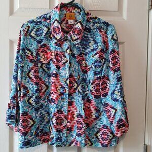 Lightweight, Aztec blue and white. Two chest button pockets, front and back seams. Roll up fixed button cuffs-- extra button included.