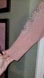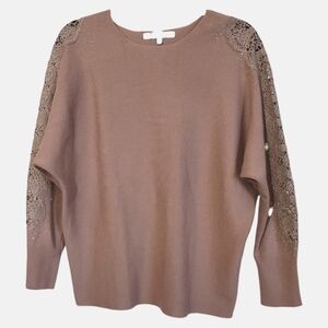 Elegant Gently Worn mauve pink knit top featuring delicate see through lace on the sleeves and rhinestones. Ideal for a chic ensemble.