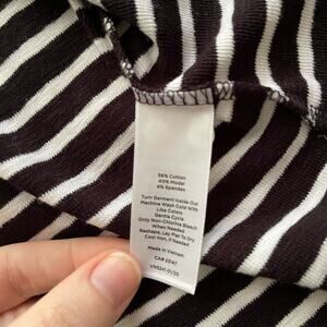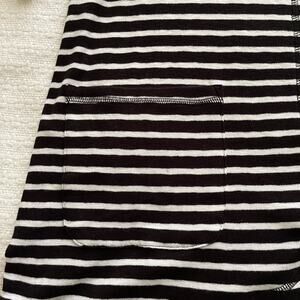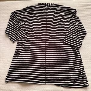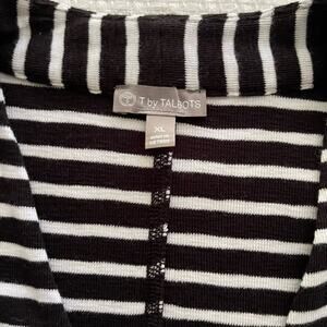 XL T by Talbots black and white stripe 3/4 sleeve open-front cardigan. Front patch pockets, ability to ruche hem at sides. 56% cotton, 40% modal, 4% spandex. This is in excellent used condition with no stains, rips, tears, or pilling. Measurements in photos.