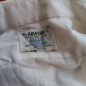 An iconic piece of mid-century fashion, this Arrow shirt features a blend of Dacron polyester and cotton, offering durability and a crisp, clean look. With its classic short-sleeve design and timeless white hue, it embodies vintage sophistication while remaining versatile for various styles.