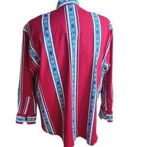 This vintage western shirt, adorned with captivating Aztec-inspired patterns, transports wearers to an era of rugged charm and timeless style. The vibrant red hue, combined with the intricate design, makes a statement in any setting. Ideal for those who appreciate the fusion of classic motifs and bold colors, it encapsulates a storied past.