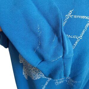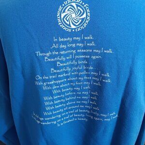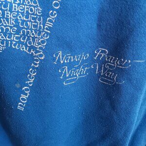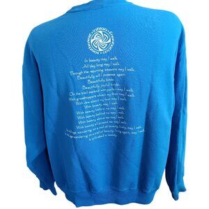 This vintage blue sweatshirt, featuring poetic Navajo inscriptions, channels spiritual artistry. Its relaxed fit and cozy fabric offer warmth, while the vivid color and intricate design evoke cultural reverence. The Southwest Indian Foundation piece stands as a timeless wearable art, bridging modern wear with ancestral wisdom.