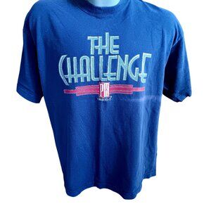 Step back in time with this vintage "The Challenge" T-shirt, emblematic of 90s culture. Crafted in a soft blue, it features a bold graphic print that resonates with nostalgia, making it a unique addition to any wardrobe.