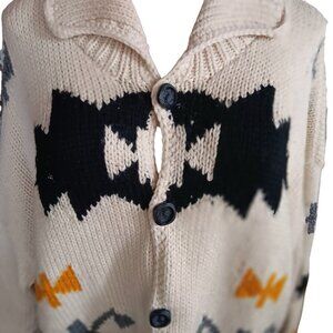This vintage cardigan sweeps you into a world of warmth and heritage, with its distinctive Southwestern pattern. Crafted from soft wool, it embodies timeless charm. Perfect for layering, the cardigan features a button front, adding a touch of classic style. It's an evocative piece, reminiscent of cozy fireside evenings.