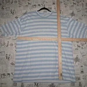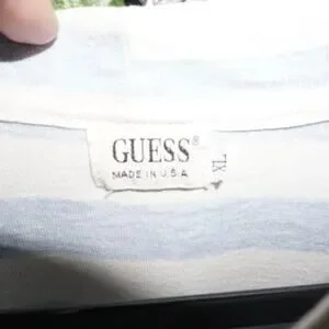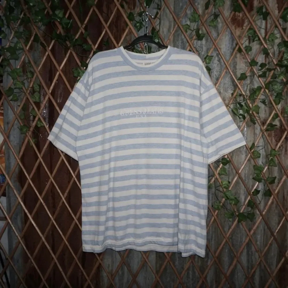 XL - Vintage / Y2K guess jeans made in USA striped embroidered T-shirt Heather blue/white color way 1990s era essential matches with everything spell out logo chest hit