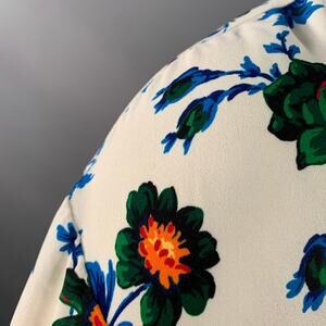 MSGM shirt in a white and multicolor polyester viscose fabrics featuring floral crepe shoulder and sleeves, with nautical twill bodice and sheer back stripe panels. Made in Italy.