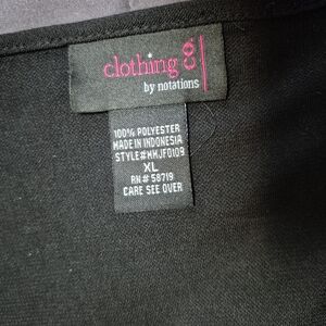 EUC Izod button-down shirt is roomy for an XL. It's a boxier cut that would pair well with a more form-fitting top underneath (like the back one!) Black notations top is gathered at the waist (empire waist) and has an interior lining.