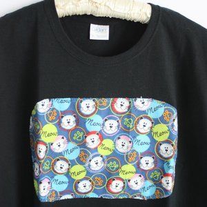 Ladies Black Short Sleeve Tee with Kitty cat Meow Pawprint cotton flannel print applique